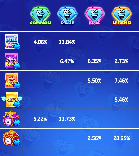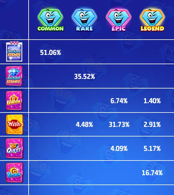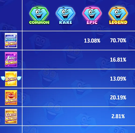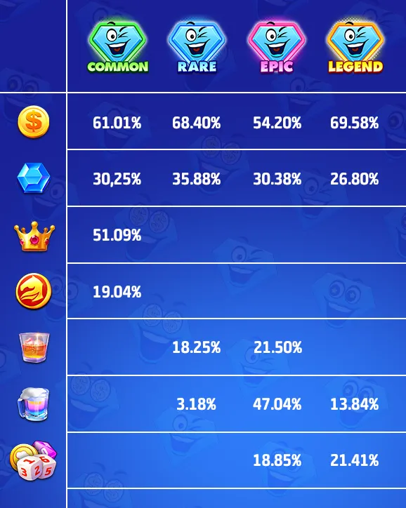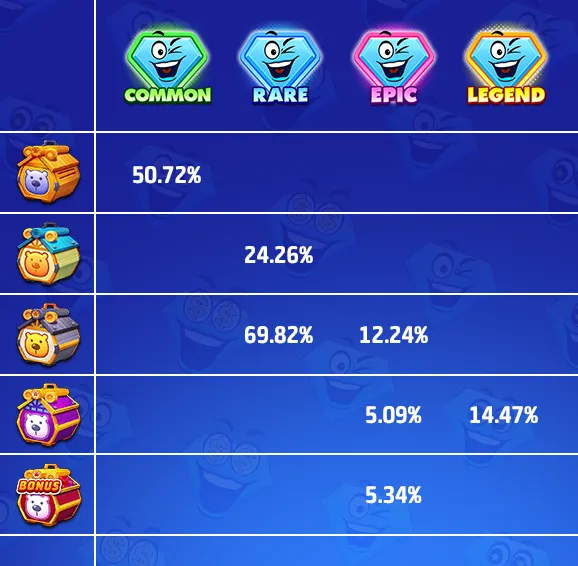 There are four rarities in total: COMMON, RARE, EPIC, LEGEND.